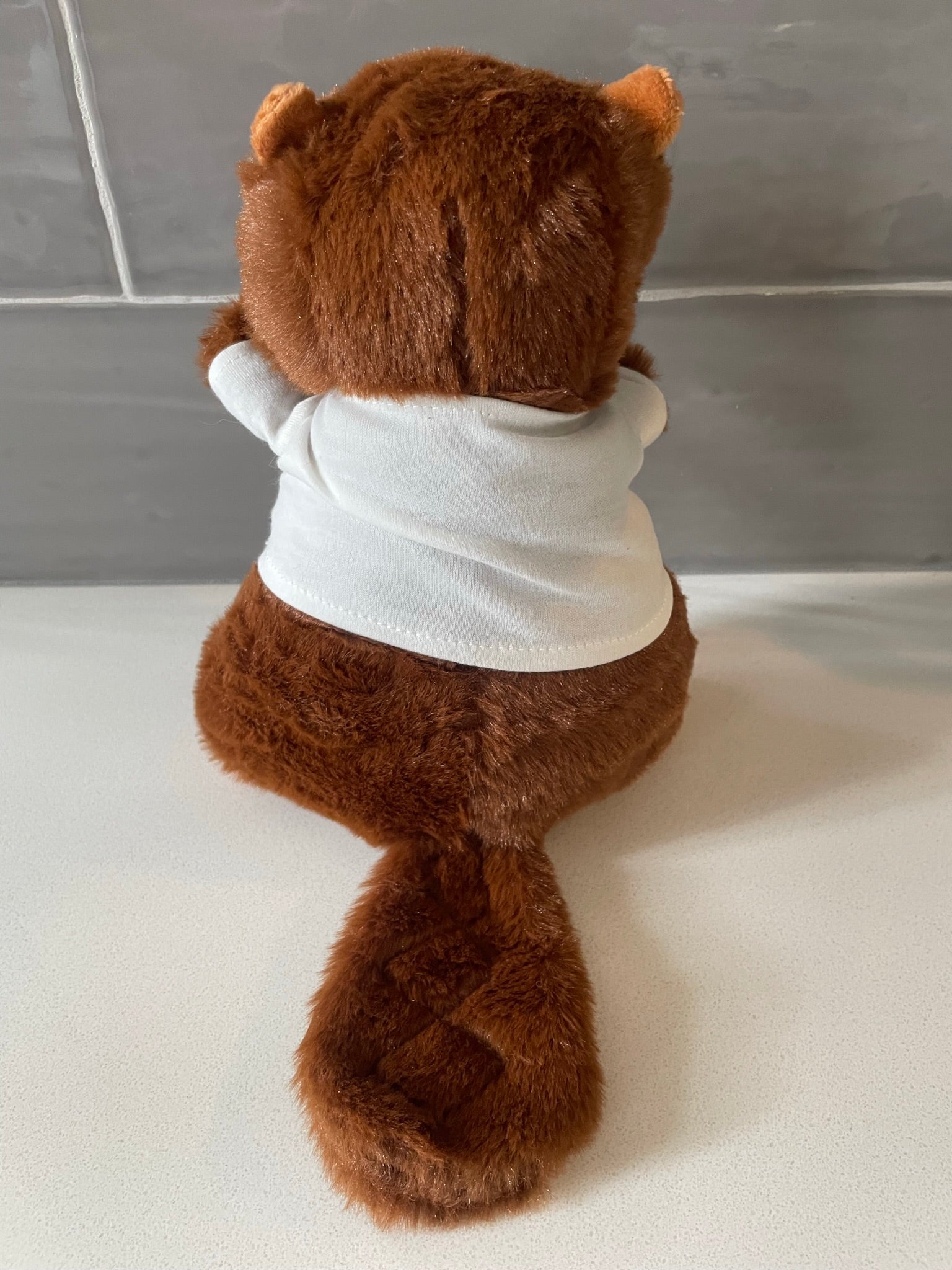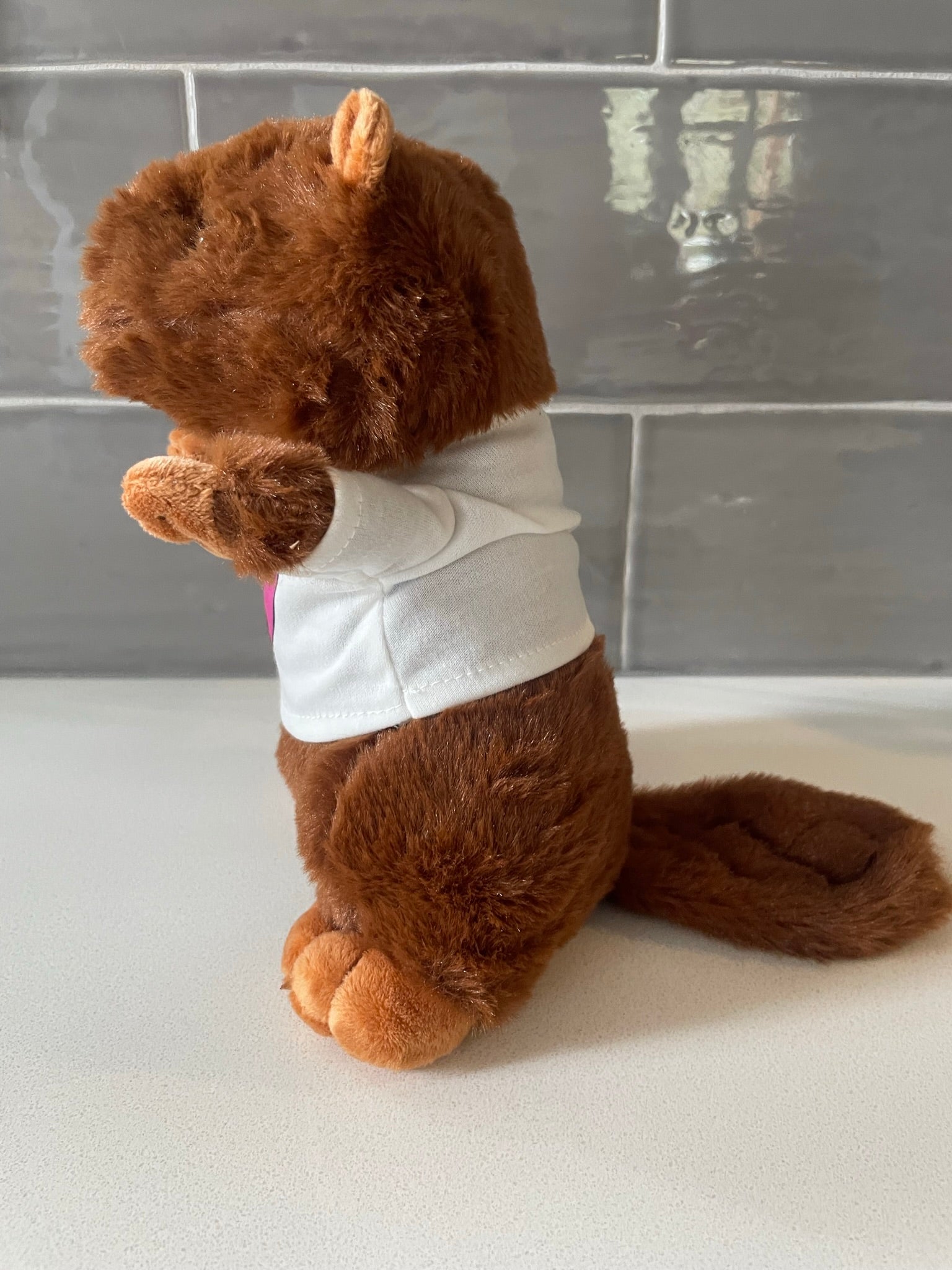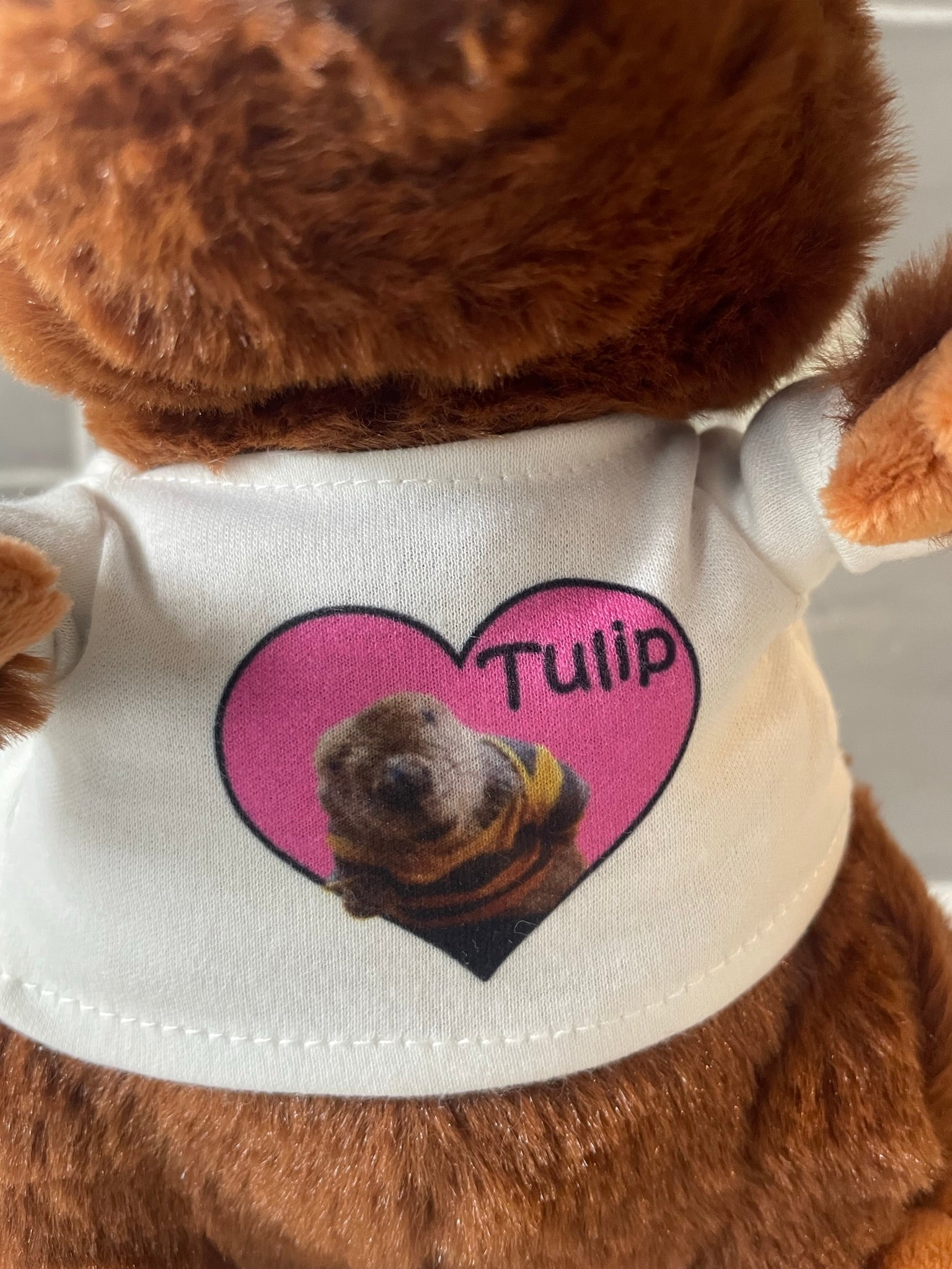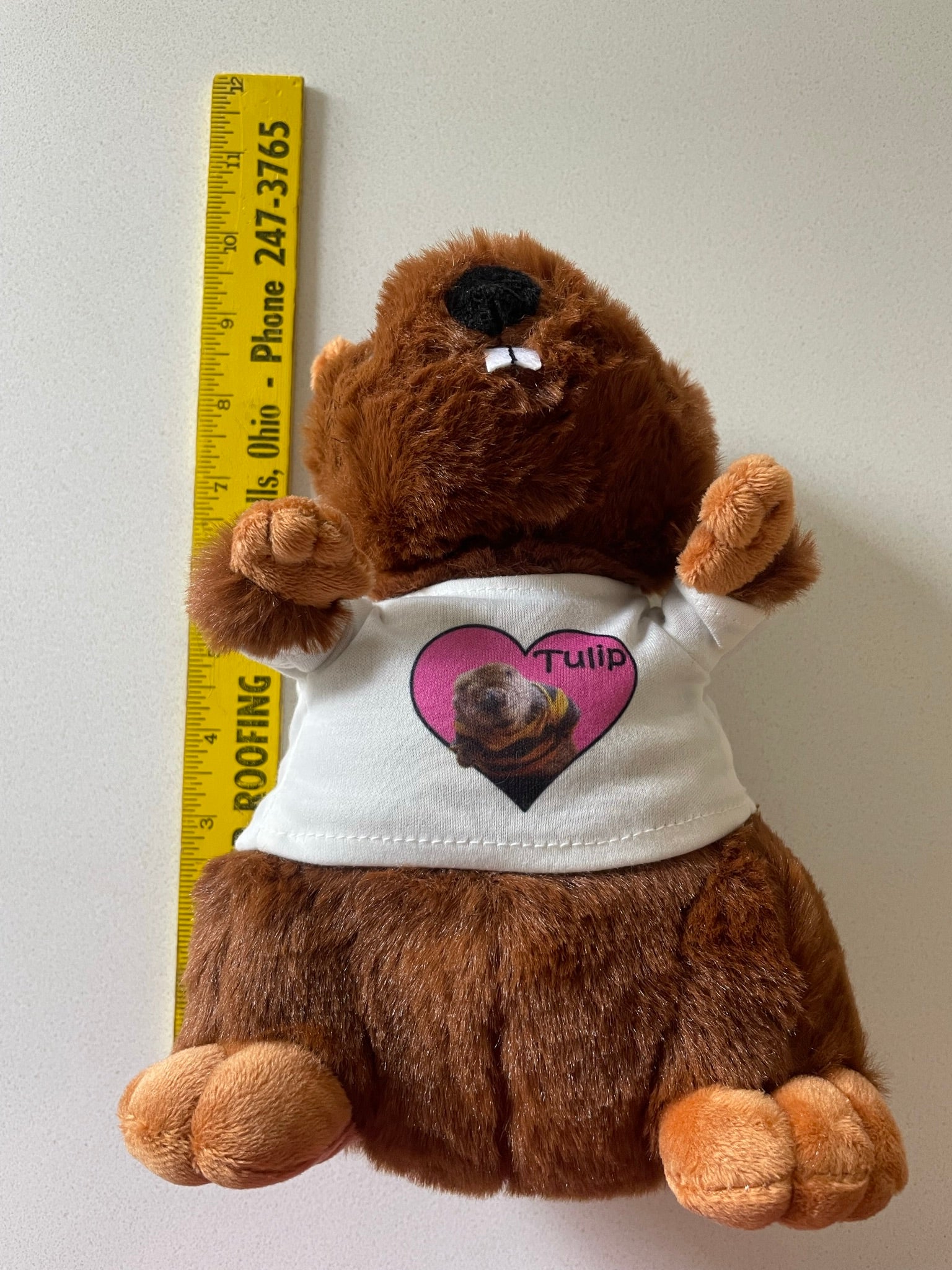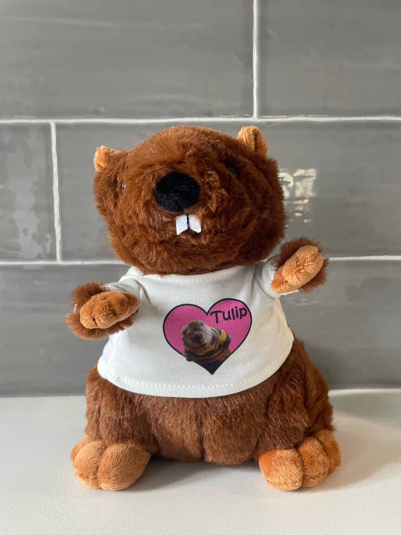 Tulip beaver plush, 8 inches tall, soft and cuddly wearing a t-shirt with a photo of Tulip in a heart. Supply is limited. Pre-Orders will be shipped first. Expect some delays in processing and shipping. We are a family operation and will go as fast as possible! Thank you for the support!